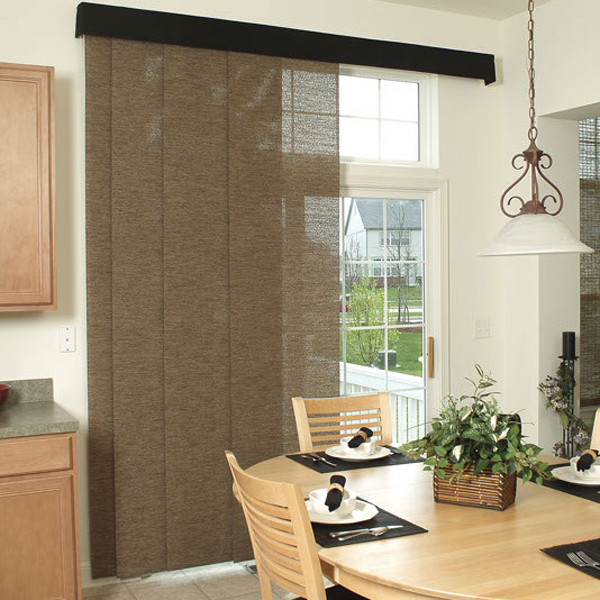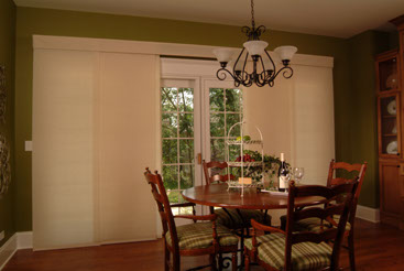 Élance Sliding Panels from Horizons Window Fashions slide to the side of the window or door and neatly stack behind each other. It is a fashionable new way to cover large windows and doors.